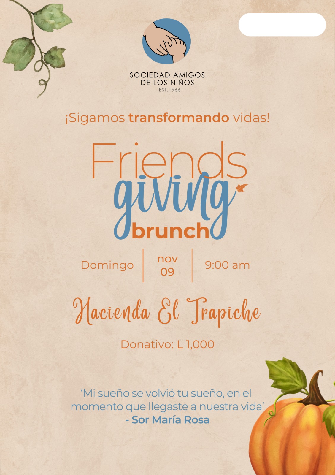 Nuestro evento anual Friendsgiving (Amigos dando) es nuestra principal iniciativa local de recaudación de fondos, para continuar impactando positivamente la vida de cientos de personitas hondureñas que nos necesitan. Su generosidad además de respaldar estas iniciativas también ayuda a mantener vivo el legado de nuestra querida Sor María Rosa.